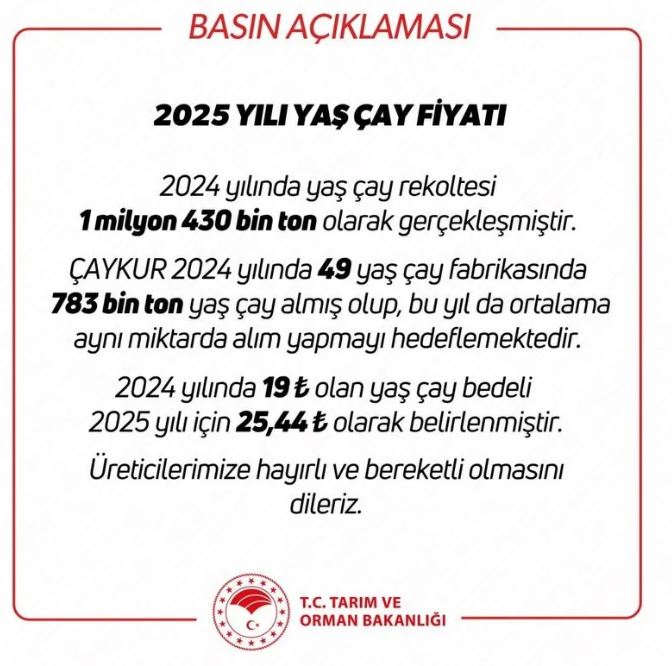 Tarım ve Orman Bakanlığı, 2025 yılı yaş çay alım fiyatını açıkladı. Buna göre, 2024 yılında 19 lira olan yaş çay fiyatı 25,44 lira olarak belirlendi.