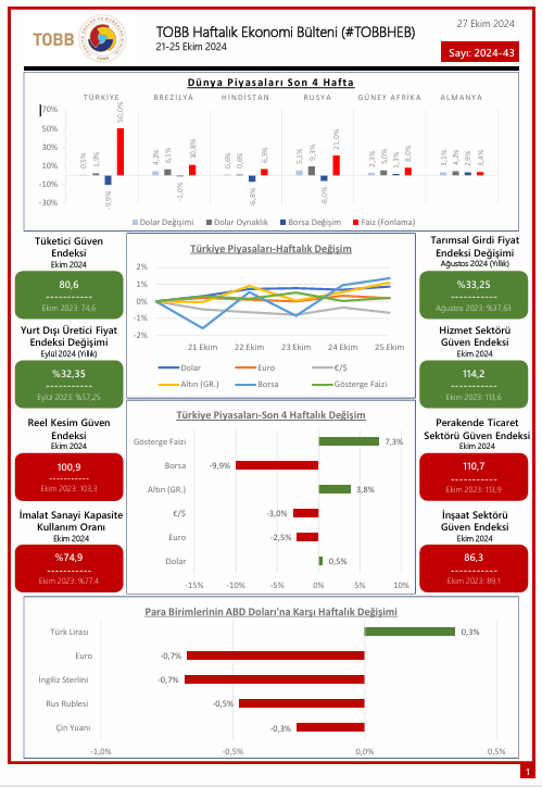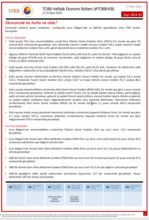 EkonomiTOBB 21-25 Ekim 2024 Haftasında Ekonomide Yaşanan Gelişmelerin Derlendiği TOBB Haftalık Ekonomi Bülteni Yayımlandı. Sayı : 2024-43 Yayınlayan: Perakende Mühendisi Tarih 27/10/2024 Kaynak : TOBB Önceki İçerikABD’li Perakende Şirketi Walmart, Türkiye’ye Geliyor!Sonraki İçerikTürkiye Ekonomisi- Ekim 2024 IMF Raporundan Öne Çıkanlar – İsmail Kahraman Perakende Mühendisihttps://www.perakendemuhendisi.com Paylaş: FacebookTwitterWhatsAppLinkedinTelegram Bültene Abone olunAbone OlGizlilik Politikası'nı okudum ve kabul ediyorum. Popüler CarrefourSA’nın A101’e satışıyla ilgili yöneticiler açıklama yaptı www.ortakalan.org A101’den Dev Satın Alma : CarrefourSA El Değiştirdi Tesco Media, Video Reklamları Satın Alma Anındaki Dijital Raflara Yerleştiriyor www.bisektor.com NielsenIQ Araştırması; Güzellik ve kişisel bakım, Türkiye’de yükselişte www.perakende.org Perakende Günleri 2026, 3-4 Haziran’da 25’inci Kez Sektörü Bir Araya Getirecek Buna Benzer Diğer İçeriklerDaha Fazlası CarrefourSA’nın A101’e satışıyla ilgili yöneticiler açıklama yaptı www.ortakalan.org Perakende Mühendisi - 17/04/2026 Kaynak : https://www.ortakalan.org/gonderi/85999 Az önce resmi olarak Kamuyu Aydınlatma Platformu'nda... A101’den Dev Satın Alma : CarrefourSA El Değiştirdi Perakende Mühendisi - 17/04/2026 Türkiye perakende sektöründe dengeleri değiştirecek önemli bir gelişme yaşandı.... Tesco Media, Video Reklamları Satın Alma Anındaki Dijital Raflara Yerleştiriyor www.bisektor.com Perakende Mühendisi - 16/04/2026 Kaynak : Tesco Media Video Reklamları Dijital Raflara Taşıyor Tesco... NielsenIQ Araştırması; Güzellik ve kişisel bakım, Türkiye’de yükselişte www.perakende.org Perakende Mühendisi - 15/04/2026 Kaynak : NielsenIQ Araştırması; Güzellik ve kişisel bakım, Türkiye’de...