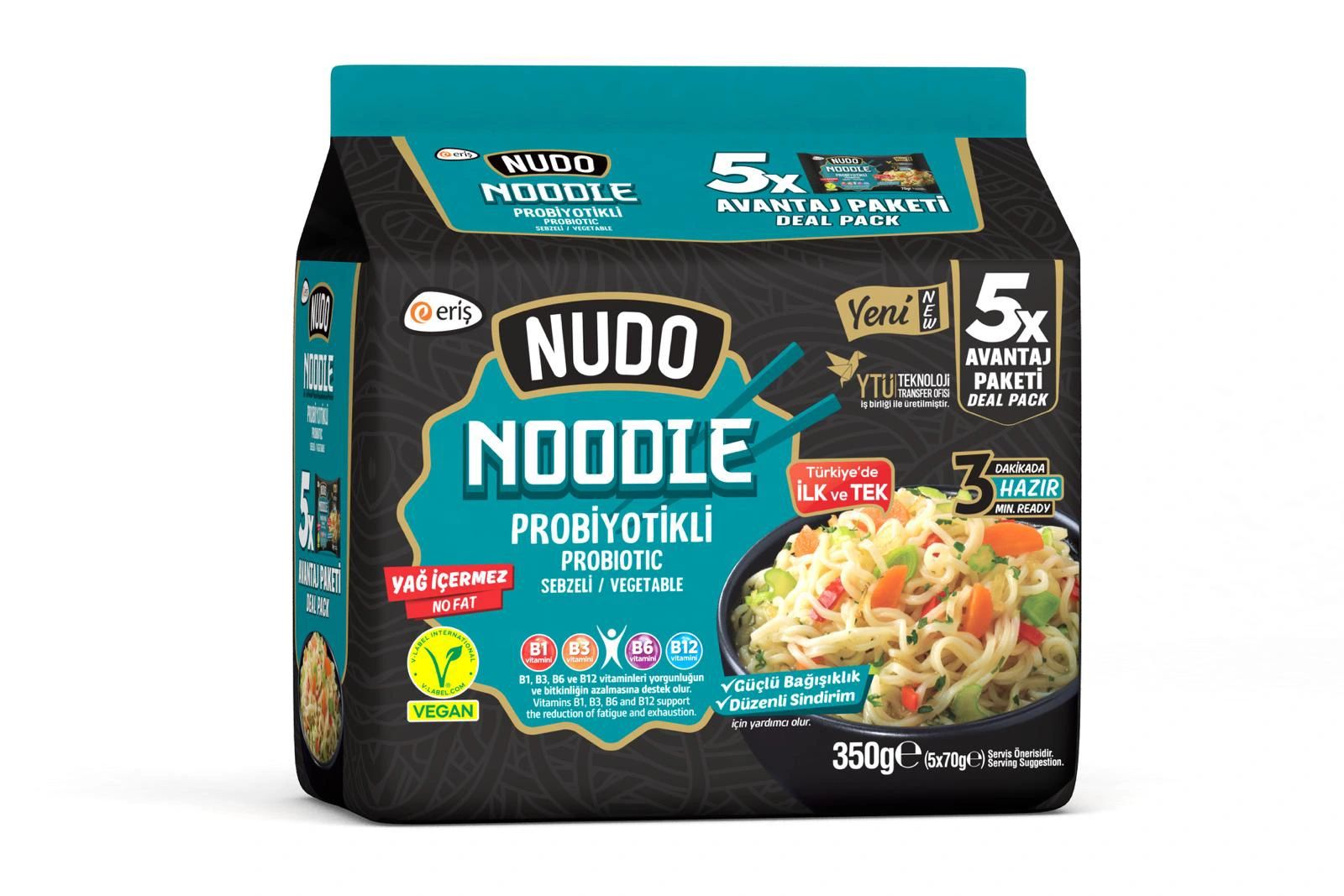 Erişler Gıda olarak Türkiye’nin ilk yeni nesil fonksiyonel Noodle’ını ürettiğimizi duyurmaktan mutluluk duyuyoruz Bu şekilde Dünya’da da endüstriyel anlamda ilk defa probiyotikli Noodle yapılmış oldu. Probiyotik bakterilerin bağışıklık sistemini güçlendirici ve sindirim sistemini düzenleyici fonksiyonlarının yanında vitaminlerin emilimini artırıcı etkisi bilinmektedir. Erişler Nudo Probiyotiklinin içinde de günlük ihtiyacın %15 lik kısmını karşılayacak kadar B1-B3- B6- B12 vitaminleri bulunmaktadır. B grubu vitaminleri de halsizlik ve yorgunluk azaltıcı etkisi ile bilinmektedir. Günde bir tane düzenli Probiyotikli Noodle tüketimi; bağışıklığınızın desteklenmesine, sindirim sisteminizin düzenlenmesine ve enerji metobolizmanızın yükselmesine yardımcı olacaktır.