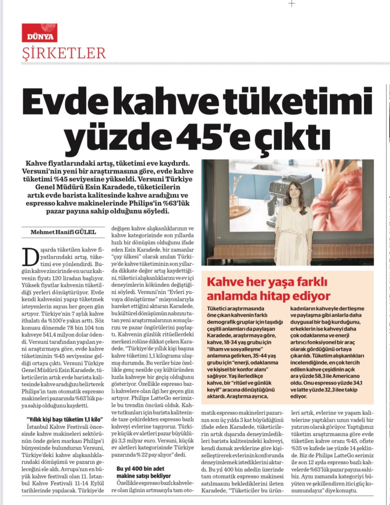 Bu veriler bize özellikle genç nesilde çay kültüründen hızla kahveye bir geçiş olduğunu gösteriyor. Özellikle espresso bazlı kahvelere olan ilgi her geçen gün artıyor. Philips LatteGo serimizle bu trendin öncüsü olduk. Kahve tutkunları için barista kalitesinde taze çekirdekten espresso bazlı kahveyi evlerine taşıyoruz. Türkiye küçük ev aletleri pazar büyüklüğü 3,3 milyar euro. Versuni, küçük ev aletleri kategorisinde Türkiye pazarında % 22 pay alıyor” dedi.