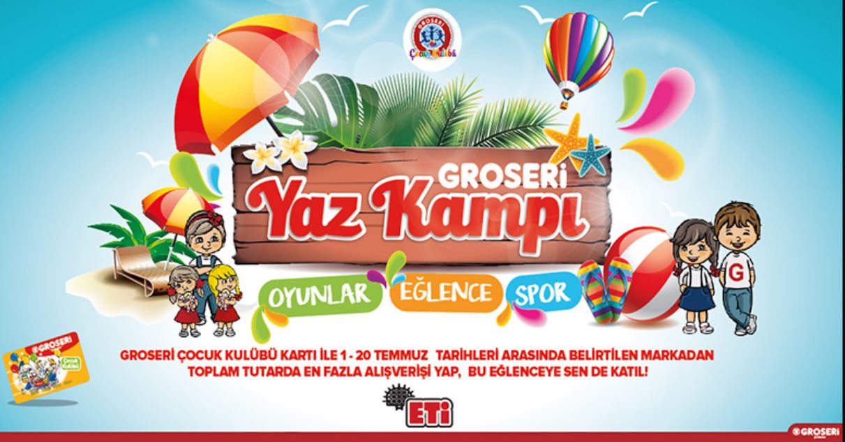 Groseri, Çocuk Kulübü kartı ile 1-20 Temmuz günleri arasında, Eti markalı ürünlerden tutarda en fazla alışveriş yapan çocuklara özel, tatil dönemlerinde yorgunluklarını atmaları, öğrenmeleri ve eğlenmeleri amacıyla bu yılda yaz kampı organizasyonu gerçekleştiriyor