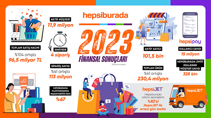 Türkiye’nin yerli sermayeli en büyük e-ticaret platformu Hepsiburada’nın 2023 yılında toplam satış hacmi %104 oranında (enflasyon düzeltmesi sonrası %31) büyüme ile toplam 96,5 milyar TL’ye (enflasyon düzeltmesi sonrası 116,5 milyar TL) çıktı.