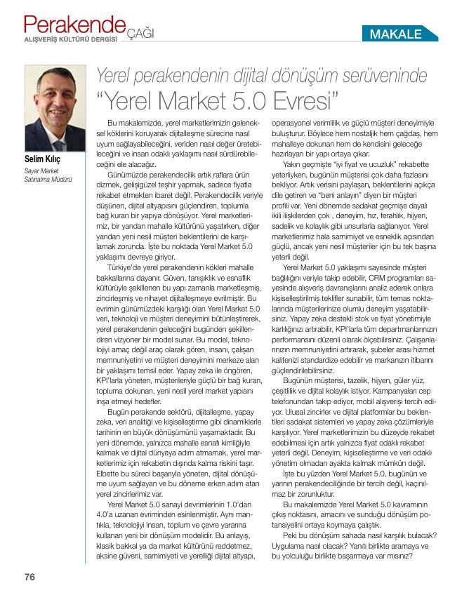 Türkiye’de yerel perakendenin kökleri mahalle bakkallarına dayanır. Güven, tanışıklık ve esnaflık kültürüyle şekillenen bu yapı zamanla marketleşmiş, zincirleşmiş ve nihayet dijitalleşmeye evrilmiştir. Bu evrimin günümüzdeki karşılığı olan Yerel Market 5.0 veri, teknoloji ve müşteri deneyimini bütünleştirerek, yerel perakendenin geleceğini bugünden şekillendiren vizyoner bir model sunar. Bu model, teknolojiyi amaç değil araç olarak gören, insanı, çalışan memnuniyetini ve müşteri deneyimini merkeze alan bir yaklaşımı temsil eder. Yapay zeka ile öngören, KPI’larla yöneten, müşterileriyle güçlü bir bağ kuran, topluma dokunan, yeni nesil yerel market yapısını inşa etmeyi hedefler.