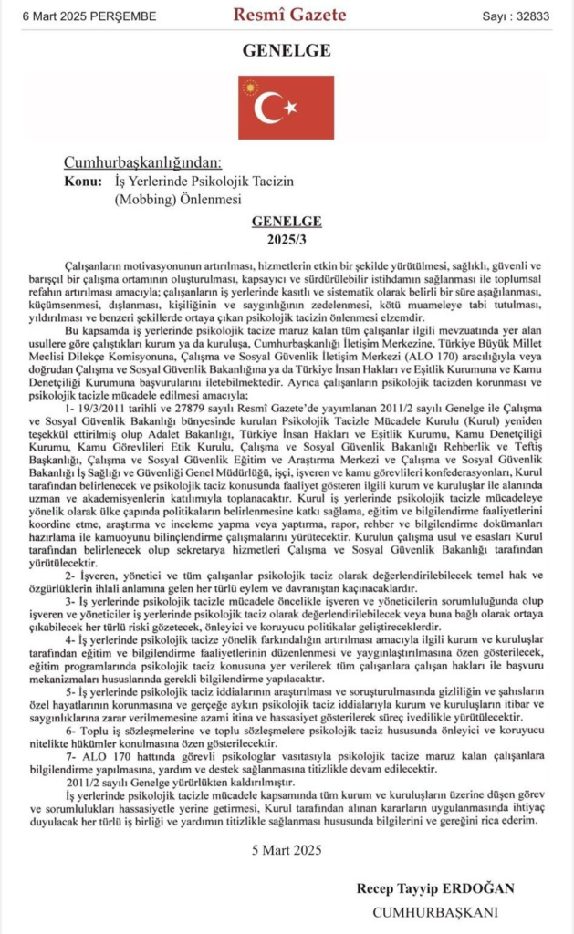 İş Yerlerinde Psikolojik Tacizin (Mobbing) Önlenmesi ile İlgili Genelge Resmi Gazete’de Yayımlandı. İş yerlerinde “mobbing” olarak adlandırılan psikolojik tacizin önlenmesine yönelik bir Cumhurbaşkanlığı Genelgesi hazırlandı. Çalışanların haklarını korumayı ve sağlıklı bir çalışma ortamı oluşturmayı hedefleyen genelge, önemli düzenlemeler içeriyor.