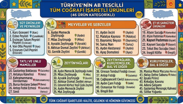Türkiye’nin AB tarafından tescillenen coğrafi işaretli ürünleri şunlar: “Gaziantep baklavası, Aydın inciri, Malatya kayısısı, Aydın kestanesi, Milas zeytinyağı, Bayramiç beyazı, Taşköprü sarımsağı, Giresun tombul fındığı, Antakya künefesi, Suruç narı, Çağlayancerit cevizi, Gemlik zeytini, Edremit zeytinyağı, Milas yağlı zeytini, Ayaş domatesi, Maraş tarhanası, Edremit Körfezi yeşil çizik zeytini, Ezine peyniri, Safranbolu safranı, Aydın memecik zeytinyağı, Araban sarımsağı, Osmaniye yer fıstığı, Bingöl balı, Bursa şeftalisi, Hüyük çileği, Bursa siyah inciri, Söke pamuğu, Manisa mesir macunu, Gaziantep menengiç kahvesi, Silifke yoğurdu, Aydın memecik zeytini, Erzincan tulum peyniri, Aydın çam fıstığı, Afyon pastırması, Afyon sucuğu, Gaziantep fıstık ezmesi, Mut zeytinyağı, Kırkağaç kavunu, Hatay kaytaz böreği, Gaziantep lahmacunu, İpsala pirinci, Bursa kestane şekeri, Yenice ıhlamur balı, Maraş çöreği, Adana şalgamı, Kayseri pastırması.”