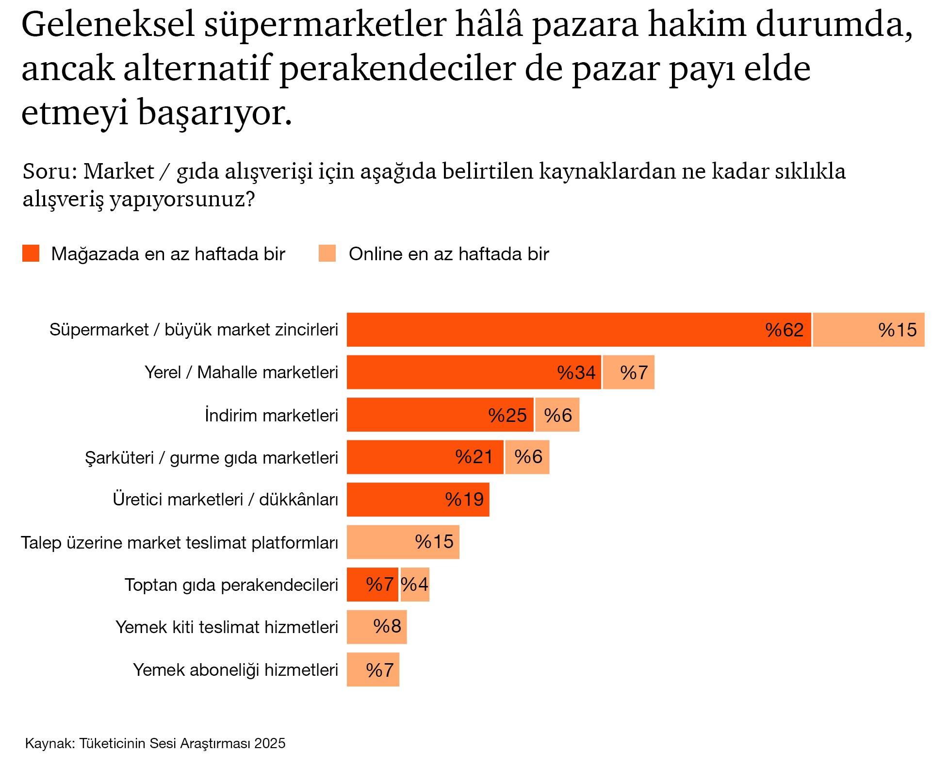 - Son bir yılda katılımcıların yaklaşık %40’ı, talep üzerine market hizmetleri ve abonelik sistemleri gibi geleneksel olmayan gıda perakende kanallarını denedi.