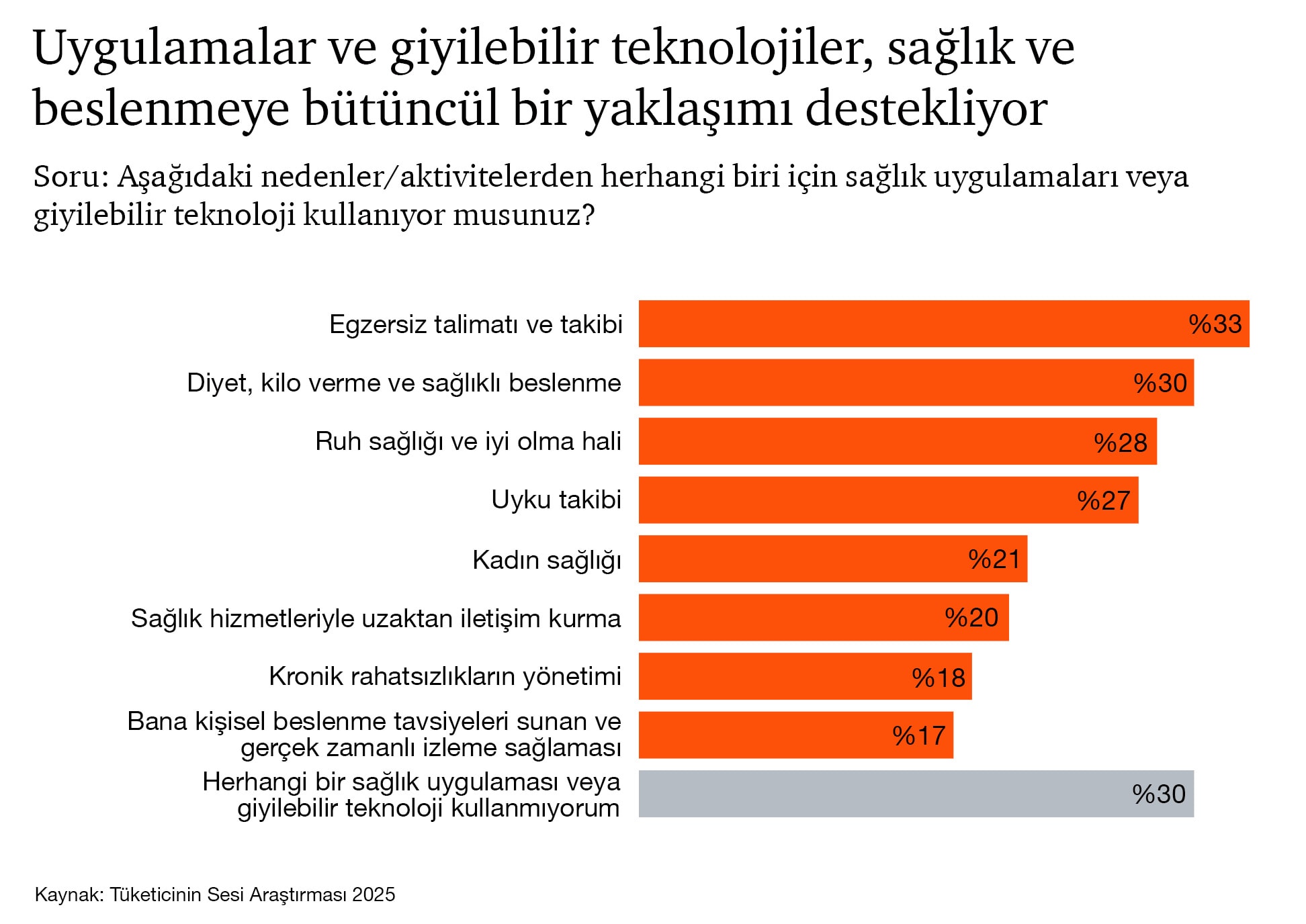 - Tüketicilerin %70’i artık sağlık uygulamaları veya giyilebilir teknolojiler kullanıyor; ‘sağlık-teknoloji meraklıları’ olarak tanımladığımız %9’luk bir grup ise bu teknolojilerin etkisiyle yaşam tarzlarında önemli değişiklikler yapıyor.