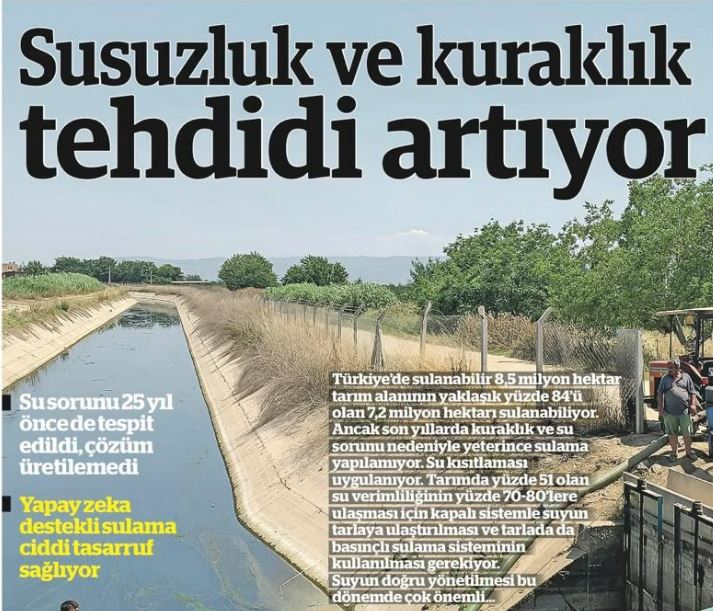 Türkiye’de sulanabilir 8,5 milyon hektar tarım alanının yaklaşık yüzde 84’ü olan 7,2 milyon hektarı sulanabiliyor. Ancak son yıllarda kuraklık ve su sorunu nedeniyle sulamaya açılan alanlar yeterince sulanamıyor. Su kısıtlaması uygulanıyor. Tarımda yüzde 51 olan su verimliliğinin yüzde 70-80’lere ulaşması için kapalı sistemle suyun tarlaya ulaştırılması ve tarlada da basınçlı sulama sisteminin kullanılması gerekiyor. Suyun doğru yönetilmesi şart.