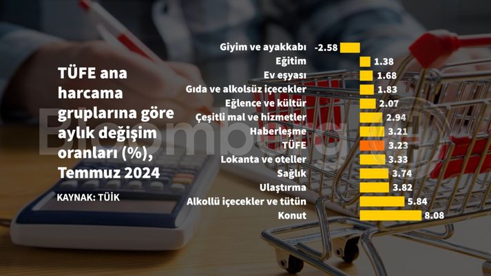 Alkollü içecekler ve tütün tarafında yapılan ÖTV zammının etkisiyle de Temmuz’da konuttan sonra en yüksek fiyat artışları bu grupta yaşandı. Temmuz’da alkollü içecekler ve tütün grubunda aylık artış yüzde 5,84 oldu.