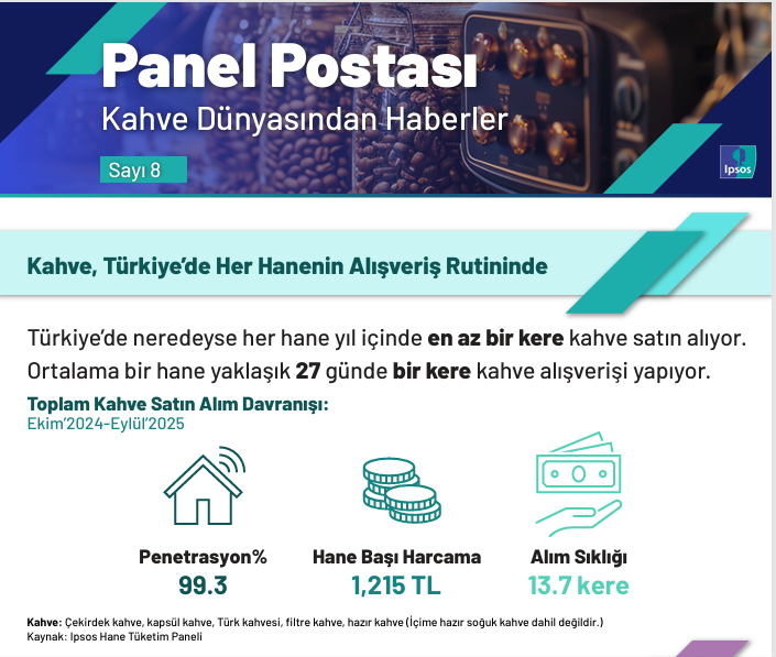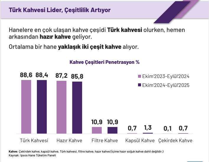 IPSOS Hane Tüketim Paneli verilerine göre, Türkiye’deki kahve pazarı son derece olgun ve yerleşik bir yapıya sahiptir. Aşağıdaki metrikler, bu durumu somut bir şekilde ortaya koymaktadır: