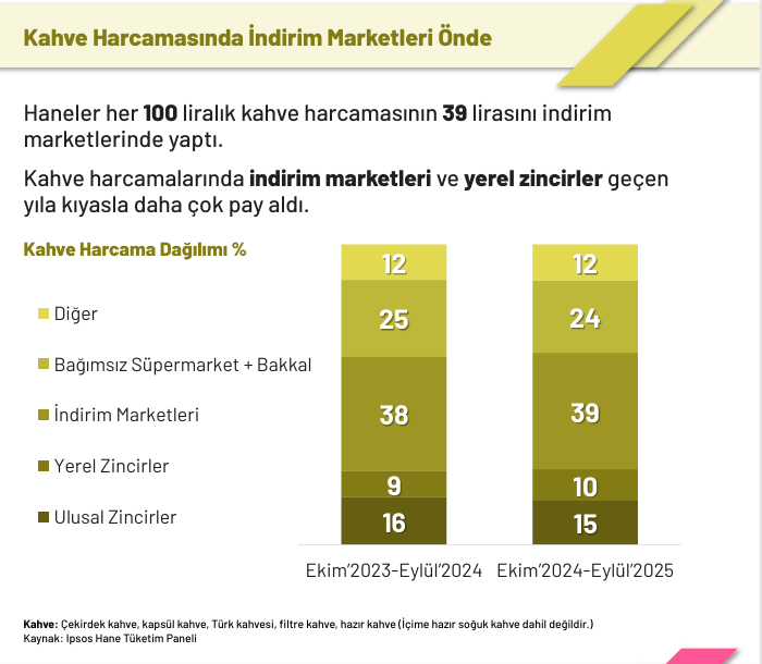 Kahve Harcamasında İndirim Marketleri Önde bulgusu, bu durumu net bir şekilde desteklemektedir. Türkiye’deki haneler, her 100 TL’lik kahve harcamasının 39 TL’sini indirim marketlerinde gerçekleştirerek bu kanalı pazarın lideri konumuna getirmiştir.