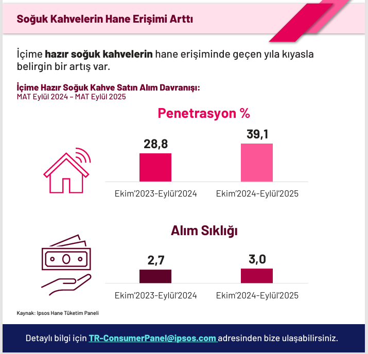 “Soğuk Kahvelerin Hane Erişimi Arttı” bulgusu, bu trendin somut bir kanıtıdır. İçime hazır soğuk kahve kategorisi, geçen yıla kıyasla hanelere erişimini belirgin bir şekilde artırmayı başarmıştır. Penetrasyon verileri bu büyümeyi net bir şekilde göstermektedir: