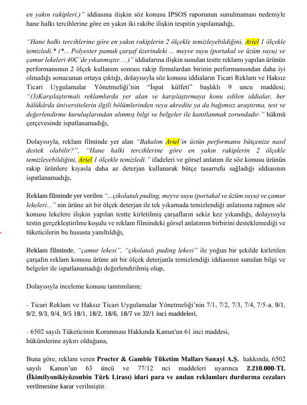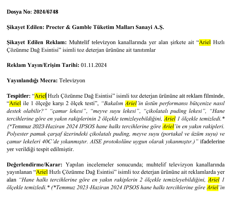 Kurul değerlendirmesinde markanın reklamında, hane halkı tercihlerine göre rakiplerinin 2 ölçekle, Ariel’in ise sadece 1 ölçekle temizlediği şeklinde sunum yapıldığı belirtildi. Ancak bu iddialar için sunulan IPSOS raporunun geçerli olmadığı ve karşılaştırmalı testlerin doğru koşullarda yapılmadığı tespit edildi.